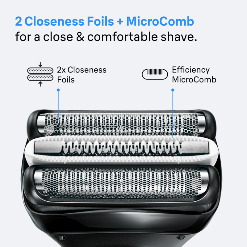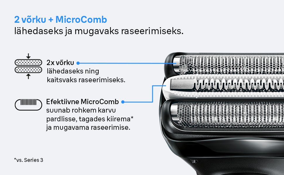 MikroComb kesktrimmer: Spetsiaalne kamm haarab iga tõmbega rohkem karvu, tagades kiirema ja sujuvama raseerimise (võrreldes Braun Series 3-ga, testitud 3 päeva habemel).
