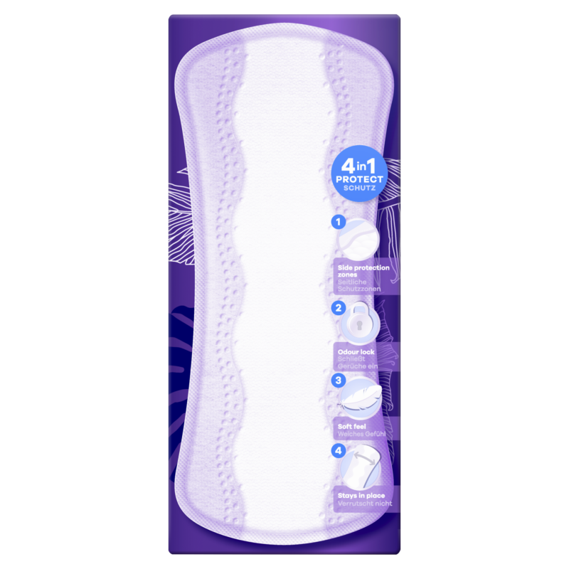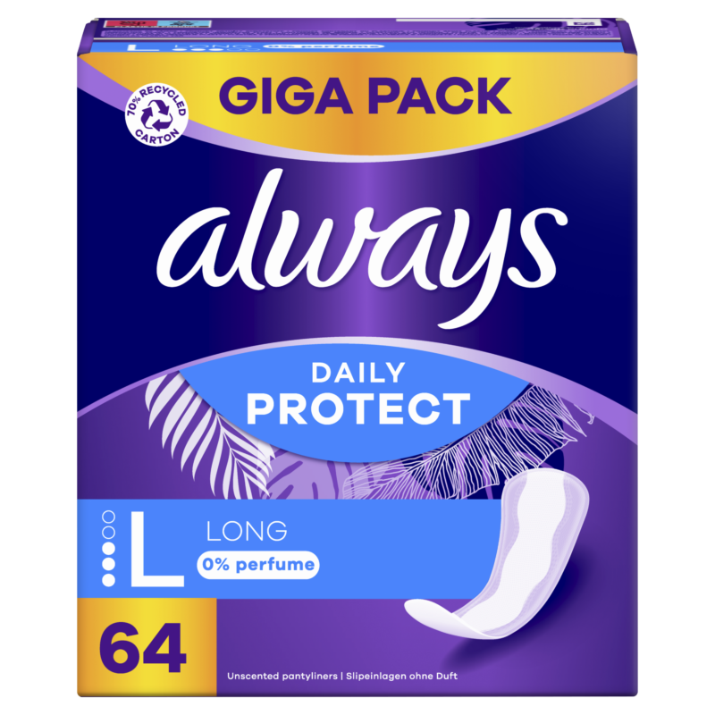 Always Daily Protecti Long pesukaitsetega oled kogu päeva jooksul kaitstud. Need lõhnatud pesukaitsed on lisapikkuse ja -laiusega, et pakkuda suuremat katvust Imava ala ja külgkaitsetega pesukaitsed pakuvad igapäevast kaitset tupeeritise, ebakorrapärase või kerge menstruatsiooni ja kerge uriinipidamatuse korral. Naudi puhaste aluspükste värskusetunnet!