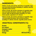 Koostis: teraviljad, õlid ja rasvad, taimset päritolu derivaadid, liha ja loomsed kõrvalsaadused, mineraalid, taimsete valkude ekstraktid, piim ja piimatooted (sh 2.2% kuivatatud juustupulbrit, mis vastab 4% juustule).