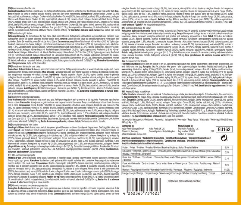 INABA CAT CHURU VARIETIES KANA 60x14g on spetsiaalselt teie kassile koostatud maiuste komplekt, mis ühendab suurepärase kvaliteediga koostisosad intensiivse kana maitsega. Hoolikalt valitud koostisosad tagavad, et iga portsjon seda maiust pakub teie kassile tõelist maitseelamust ja olulisi toitaineid.