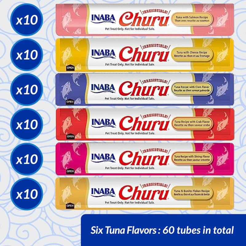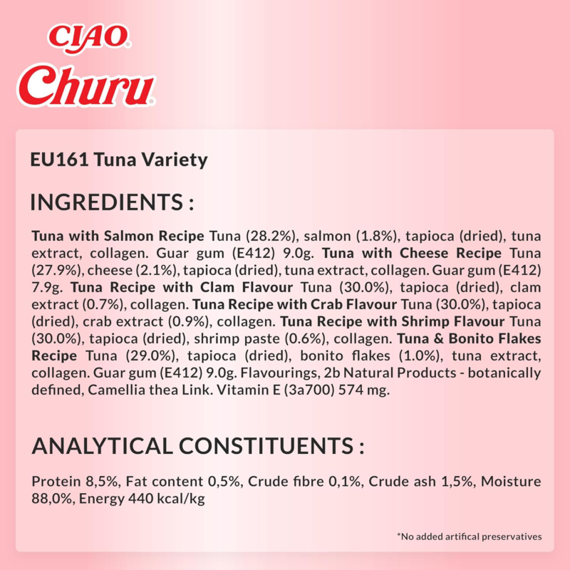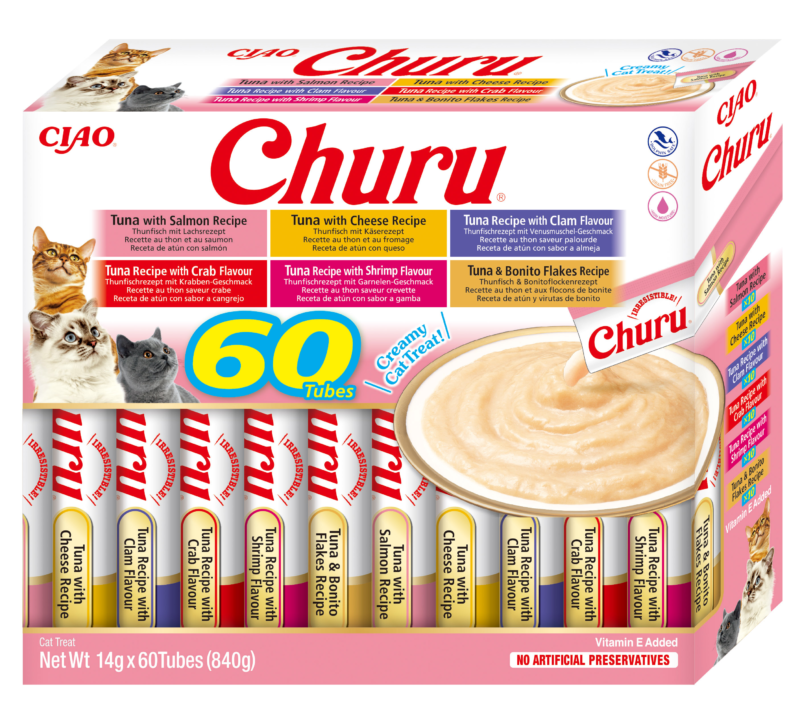 NABA CAT CHURU Variety Tuna 60x14g on spetsiaalselt valitud maiuste kogu teie kassile, millel on hõrk tuunikala maitse. Hoolikalt valitud koostisosad tagavad, et iga portsjon pakub teie kassile nii intensiivset maitset kui ka olulisi toitaineid.