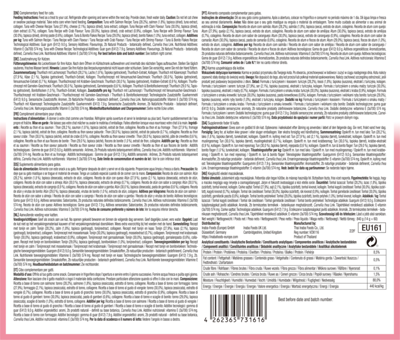 10 x tuunikalavalem rannakarpide maitsega: tuunikala (30,0%), tapiokk (kuivatatud), rannakarbiekstrakt (0,7%), kollageen.