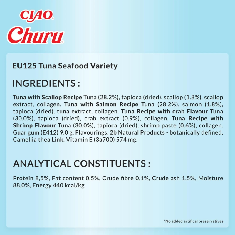 Uskumatult maitsvad ja tervislikud maiused, mis on valmistatud kõrgeima kvaliteediga, „inimtoidukvaliteediga“ koostisosadest. Churu maiused on madala kalorsusega, teraviljavabad ja säilitusainetevabad. Need on valmistatud vabapidamisel kasvatatud kanadest rangelt kontrollitud farmides ning jätkusuutlikult püütud, sertifitseeritud delfiiniohutu süvamere tuunikalaga.