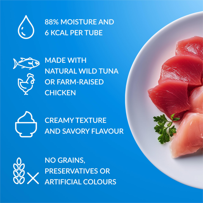 Spetsiaalselt disainitud pakend võimaldab sööta kassi otse käest. Avage tuub ja pigistage õrnalt – kass võib maiust lakkuda otse või pigistage sisu kaussi.