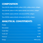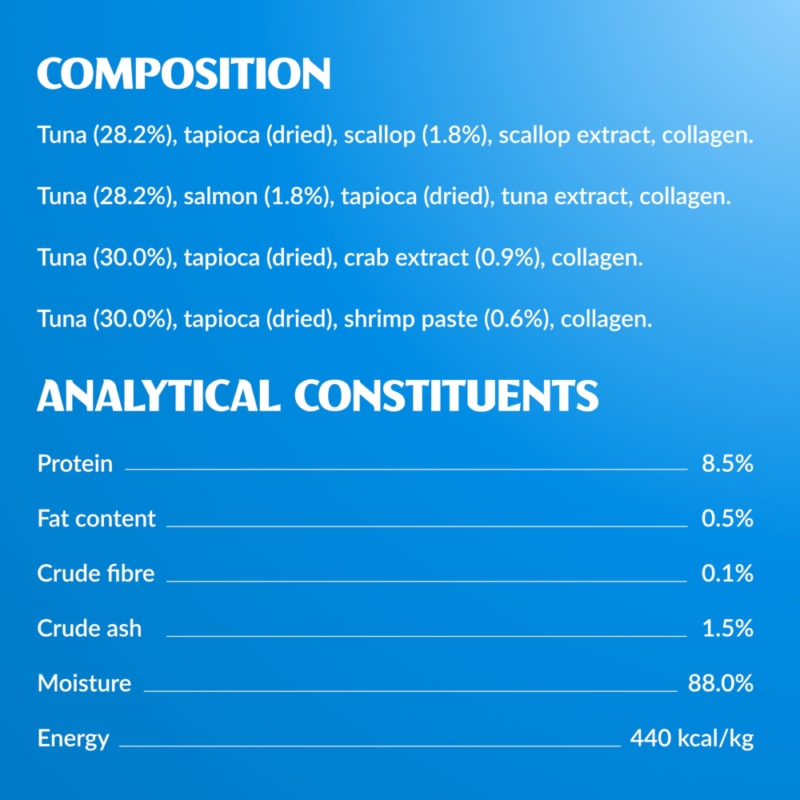 Tuunikala (30,0%), tapiokk (kuivatatud), krabiekstrakt (0,9%), kollageen.