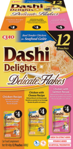 Dashi Delightes – siidine puljong sametise Dashi puljongina kanatükkidega ja Dashi Delightes pehmed helbed, mis on pehmete želeetaoliste kanatükkidega täis Dashi maitset, saadaval 12 x 40 g pakendites!