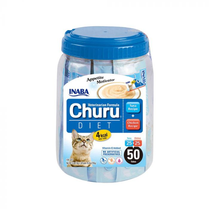 Churu Diet on saadaval 50 tk purgis, mis sisaldab 25 kana- ja 25 tuunikalamaitselist portsjonit.