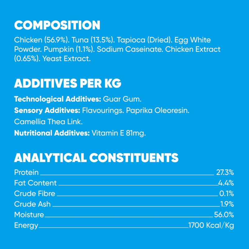 Koostis: Kana (56,9%), tuunikala (13,5%), tapiokk (kuivatatud), munavalgepulber, kõrvits (1,1%), naatriumkaseinaat, kanaekstrakt (0,65%), pärmiekstrakt.
