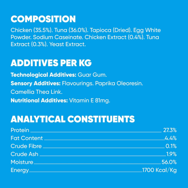 Koostis: Kana (35,5%), tuunikala (36%), tapiokk (kuivatatud), munavalgepulber, naatriumkaseinaat, kanaekstrakt (0,4%), tuunikalaekstrakt (0,3%), pärmiekstrakt.