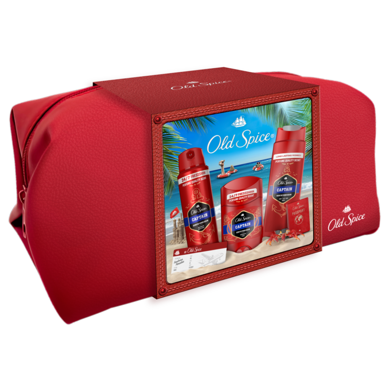 Reisikotis olev kinkekomplekt sisaldab Captain kuiva deodoranti, pihustatavat deodoranti ja meeste dušigeeli, mis kõik on pakitud erilisse Old Spice’i kosmeetikakotti. Seda saab korduvalt kasutada, et võtta kaasa tualett-tarbeid reisile või treeningule. Old Spice Captain’i kvaliteetne aroom ei vea sind alt: võimsate ookeanilainete, sandlipuu ja mahlaka bergamoti lõhn muudab sind kartmatuks värskuse kapteniks.