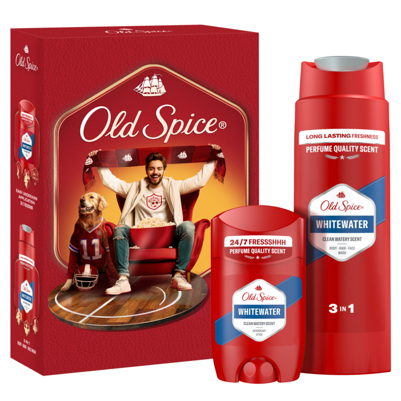 Otsid ideaalset kingitust spordifännile, kes innustab kirglikkuse, entusiasmi ja legendaarse lõhnaga? Siin see on! Kingituskomplekt sisaldab Whitewater meestele mõeldud kuiva deodoranti ja dušigeeli, mis on kaunilt pakitud Sports Fan disainiga kartongkarpi. Old Spice Whitewater kvaliteetne aroom ei vea sind alt: värske vee, sandlipuu, sidruni ja merevaigu nootide lõhn muudab sind tõeliselt vastupandamatuks. Miks ei ole see Old Spice’i kingituskomplekt veel sinu ostukorvis? (*kasutades dušigeeli ja deodoranti).