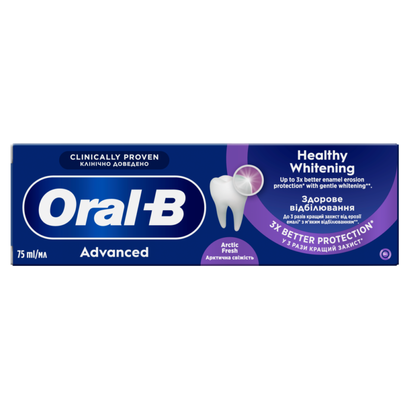Hambapasta Oral-B Advanced Healthy Whitening Arctic Fresh on kliiniliselt tõestatud: kuni 3 korda parem kaitse hambaemaili kulumise vastu võrreldes tavalise hambapastaga. Eemaldab õrnalt pindmised plekid. Oral-B ainulaadne bakterivastane tehnoloogia tinafluoriidi kompleksiga moodustab kaitsekilbi, mis kaitseb hambaemaili kulumise eest, eemaldab õrnalt pindmised plekid ja värskendab hingeõhku, isegi harjamiste vahel. Igapäevane hambapasta.